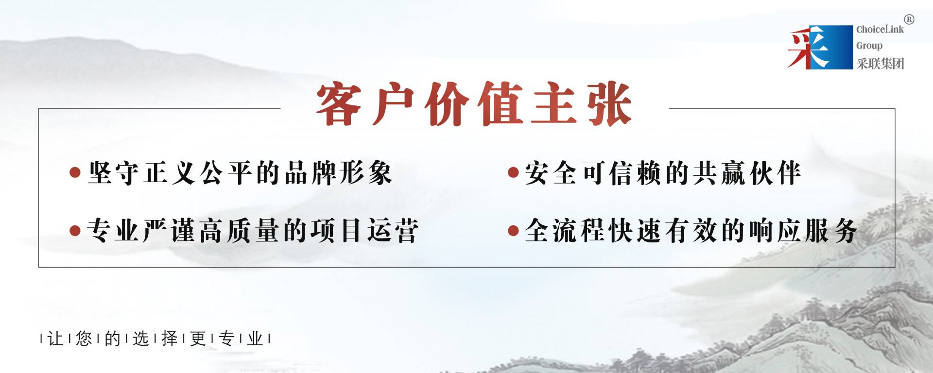 采聯集團致力于為廣大客戶提供采購全流程專業服務,堅守“守正出奇”的核心價值觀,以公平公正為原則,不斷優化服務、堅持創新發展。依托多元化、專業化的服務,不斷向“締造最具創新力的采購服務品牌,構筑采購領域最專業的資源交互平臺”的遠大愿景邁進。